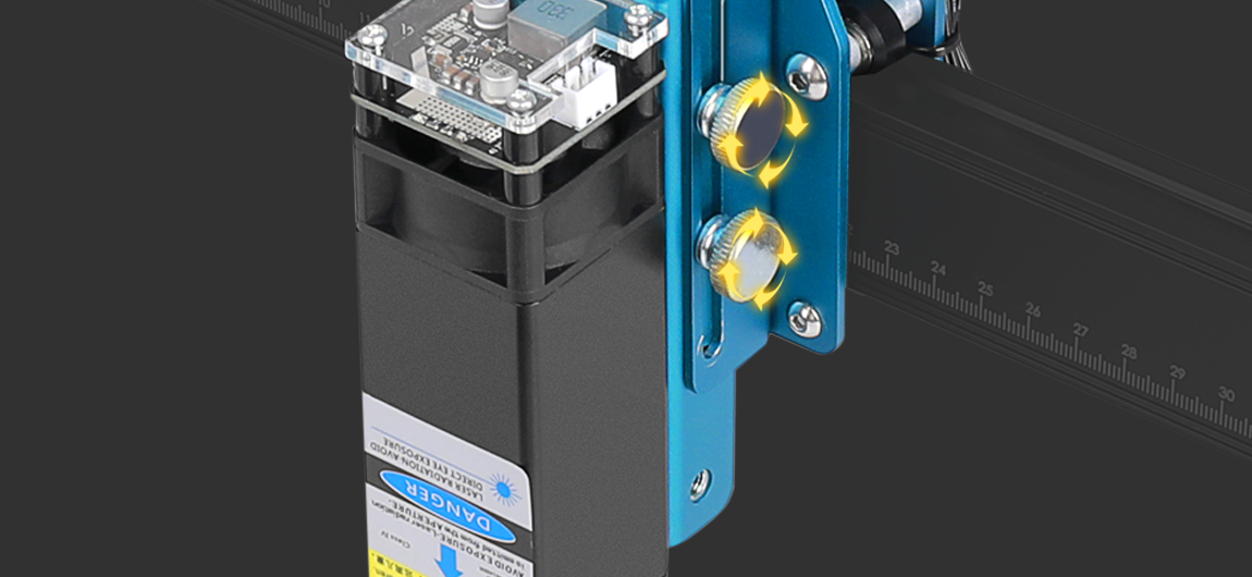 Ihr Laser ist werkseitig für eine präzise Fokussierung kalibriert. Sie müssen Ihren Finger nicht auf den Laser legen, um den Fokus einzustellen. Lösen Sie einfach die Einstellschraube an der Seite, legen Sie den Höhenblock auf die zu gravierende Oberfläche, senken Sie den Laser ab und ziehen Sie die Rändelschraube fest. Fertig! Sie sind fertig.