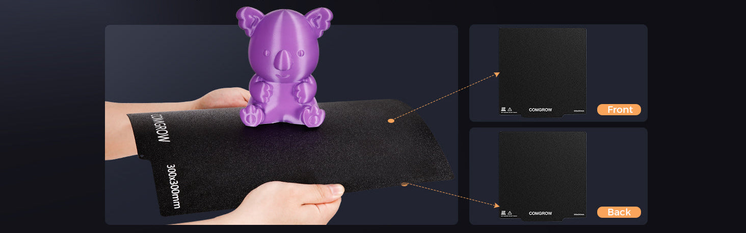 T300 verfügt über eine langlebige doppelseitige PEI-Folie, die Ihnen Zeit und Geld beim Austausch spart. Sie bietet starken Magnetismus und hervorragende Haftung, sodass sich das Modell mühelos von Hand entfernen lässt.