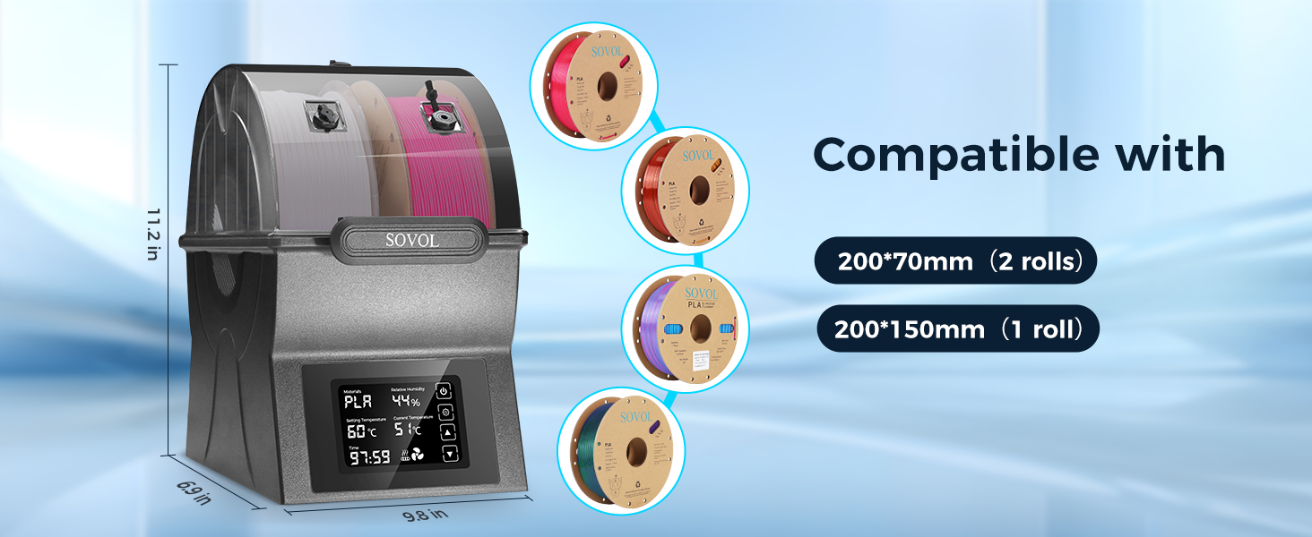Die SH02 Filament Dryer Box kann erreichen eine Trocknungstemperatur von 70°C in nur 25 Minuten, wodurch eine schnelle und effiziente Filamenttrocknung ermöglicht wird, sodass Ihre Filamente immer einsatzbereit sind.