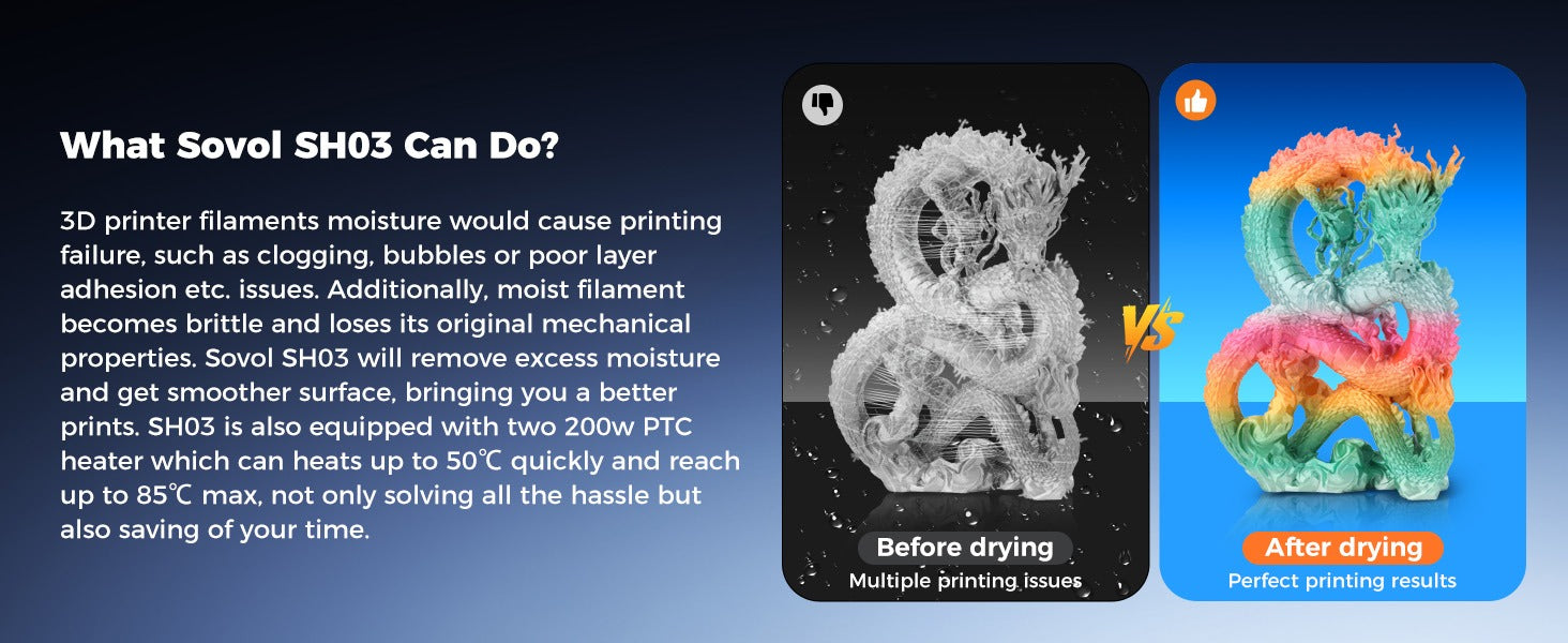 Watch our official video to discover how the Sovol SH03 Filament Dryer elevates your printing results with its powerful dual-chamber drying system and smart moisture-control technology.